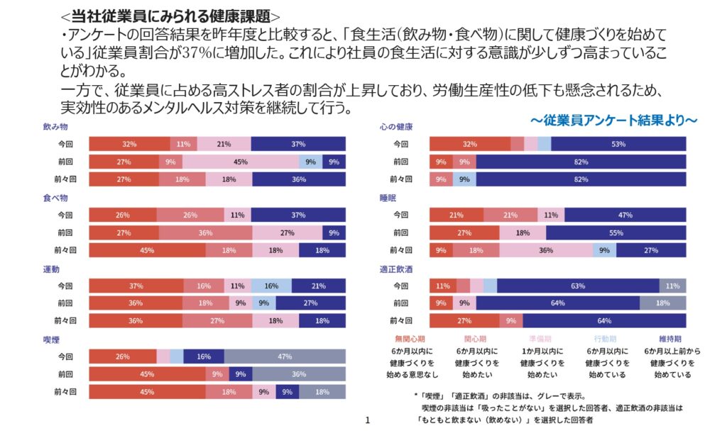 弊社では1年に1度、従業員に向けたアンケートを実施し、具体的な健康課題の把握に役立てています。