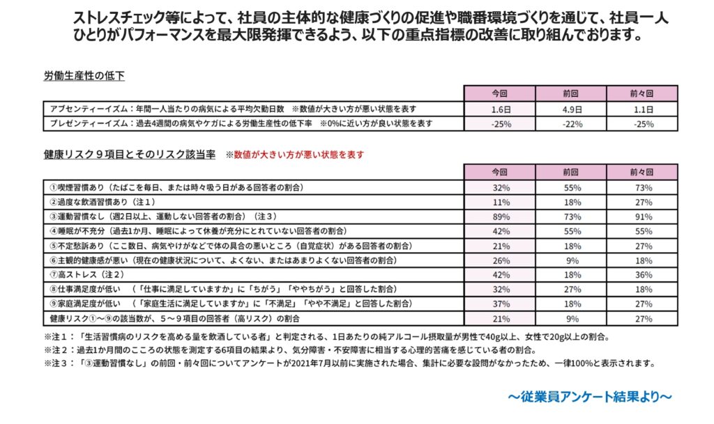 ストレスチェック等によって、社員の主体的な健康づくりの促進や職場環境づくりを通じて、社員一人ひとりがパフォーマンスを最大限発揮できるよう、これらの重点指標の改善に取り組んでいます。