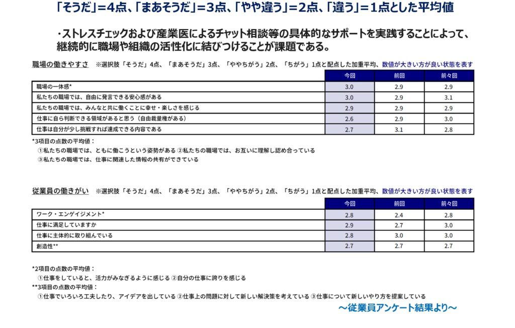ストレスチェックおよび産業医によるチャット相談等の具体的なサポートを実践することによって、継続的に職場や組織の活性化に結び付けることが課題となっています。