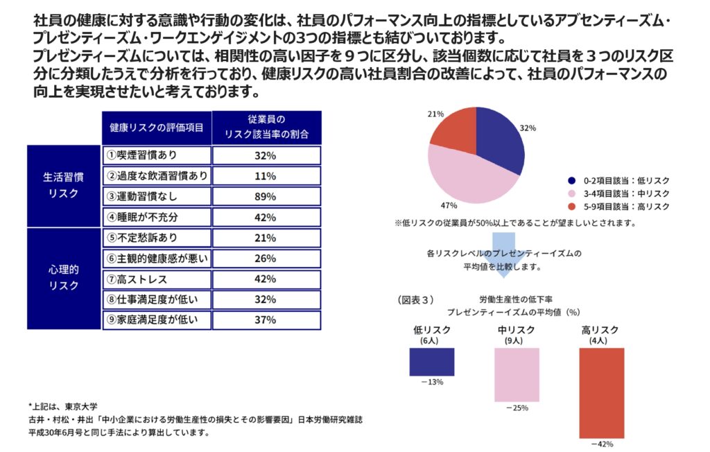プレゼンティーズムについては、相関性の高い因子を9つに区分し、該当個数に応じて社員を3つのリスク区分に分類したうえで分析を行っており、健康リスクの高い社員割合の改善によって、社員のパフォーマンスの向上を実現したいと考えています。